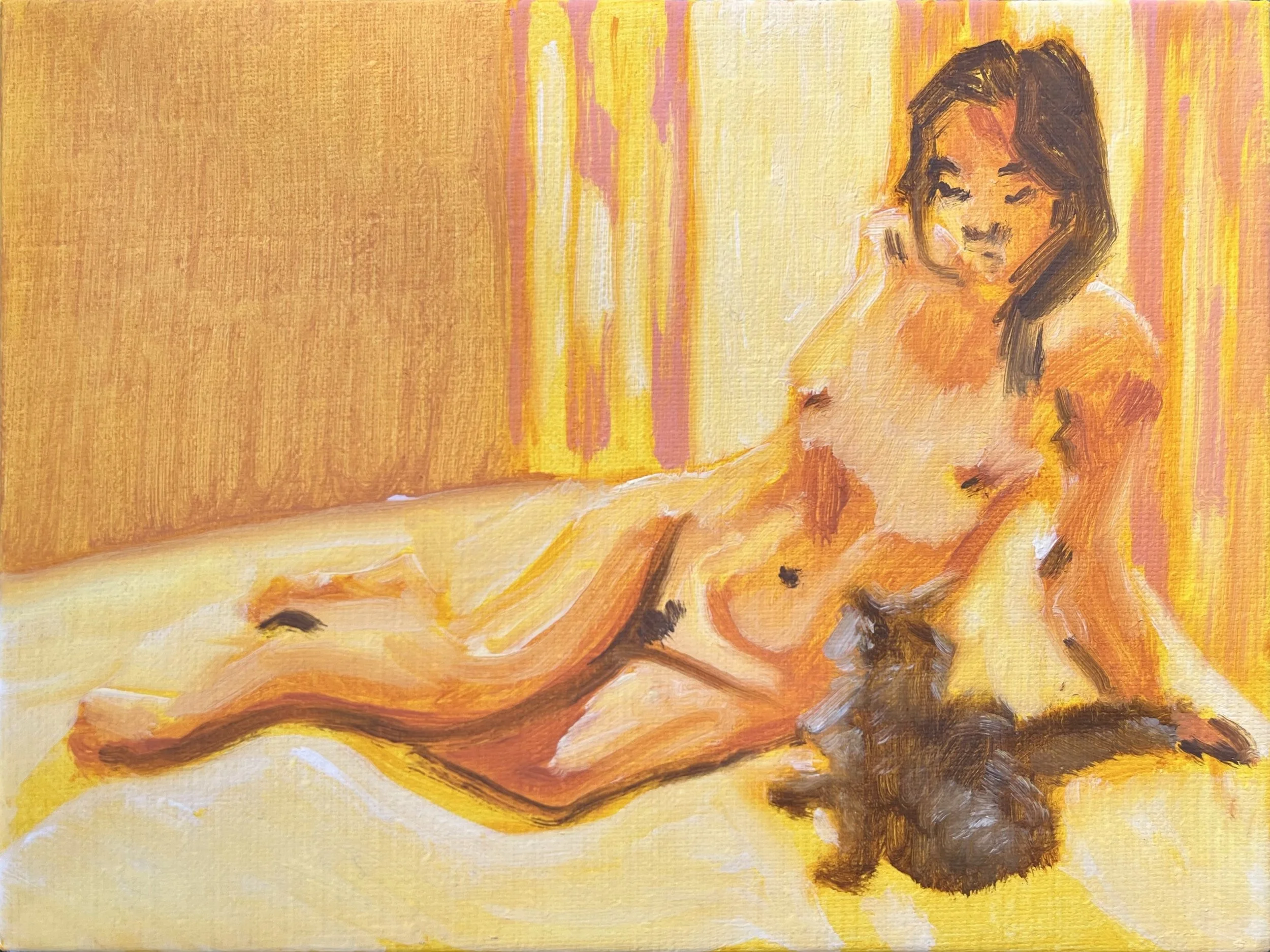 Skittles Sleeping In Green, 2023. Oil on canvas. 9x12"